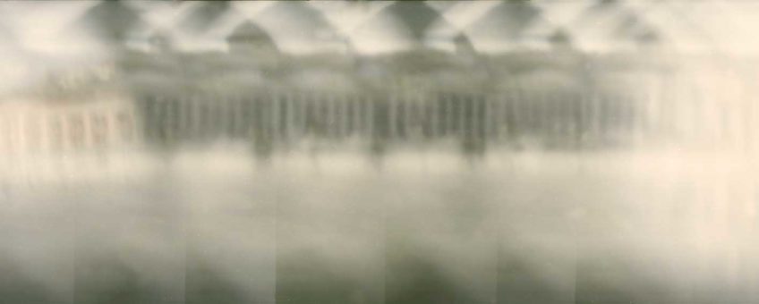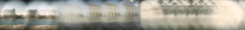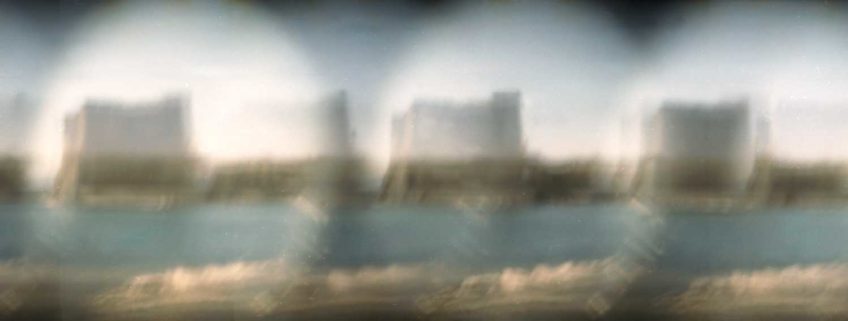 Per la realizzazione di quest’opera ho deciso di utilizzare il foro stenopeico che è l’antesignano della macchina fotografica, sperimentando una tecnica a cui ho dato il nome di Flusso Stenopeico: mentre impressiono la pellicola, riavvolgo il rullo creando un immagine di movimento nel movimento che supera i limiti del fotogramma, ne viene fuori un’unica striscia di immagini senza interruzioni; il risultato è dunque una fotografia lunga 36 fotogrammi. Il nome Flusso Stenopeico cerca di racchiudere questo processo: il Flusso è inteso in termini astronomici come il flusso di energia che passa ogni secondo in un centimetro quadrato*. Stenopeico, dal greco stenos opaios, significa stretto foro; dunque il Flusso Stenopeico, indica il flusso di luce che entra in un piccolo foro ogni secondo impressionando la pellicola che nel frattempo si muove.