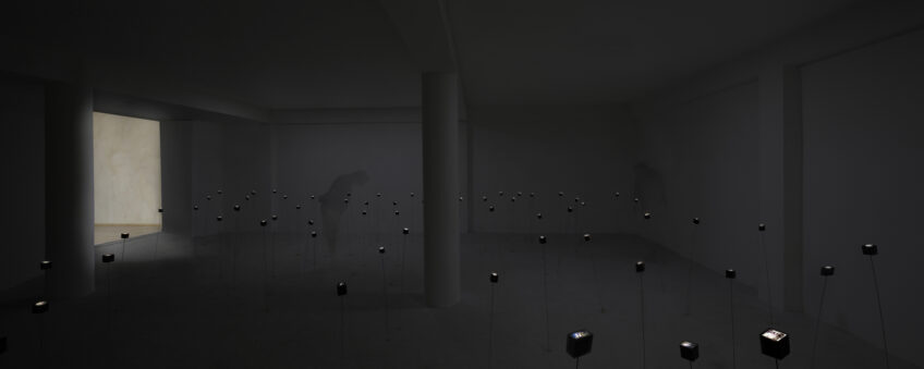 Entrando in una grande stanza buia dove ci sono una serie di minuscole lucine fioche che scintillano nell’oscurità e ci indicano la strada da percorrere. Queste luci sono in realtà singole diapositive retro-illuminate che rappresentano la salvezza che risiede dentro di noi, nei nostri legami e nell’amore.
